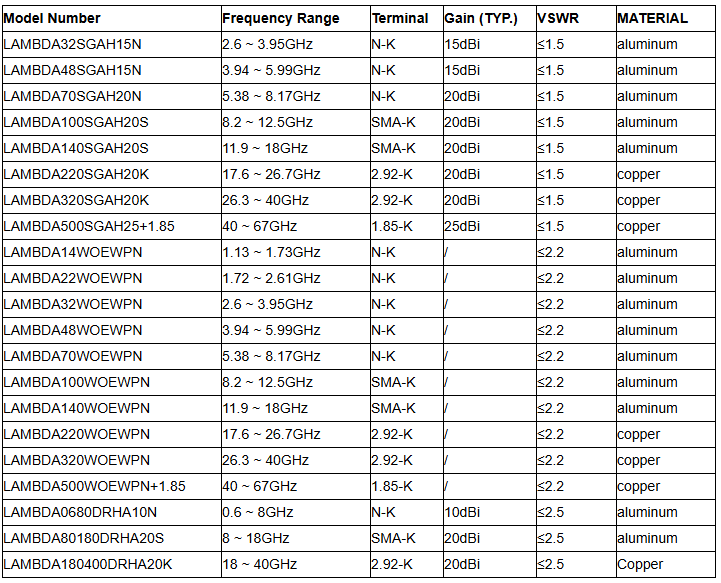 LAMBDA Series Horn & Waveguide  provides a wide frequency range of Microwave and Millimetre-wave antenna up to 110GHz, such as Standard Gain Horn Antenna, Broadband Horn Antenna, which can be customized for requirements.