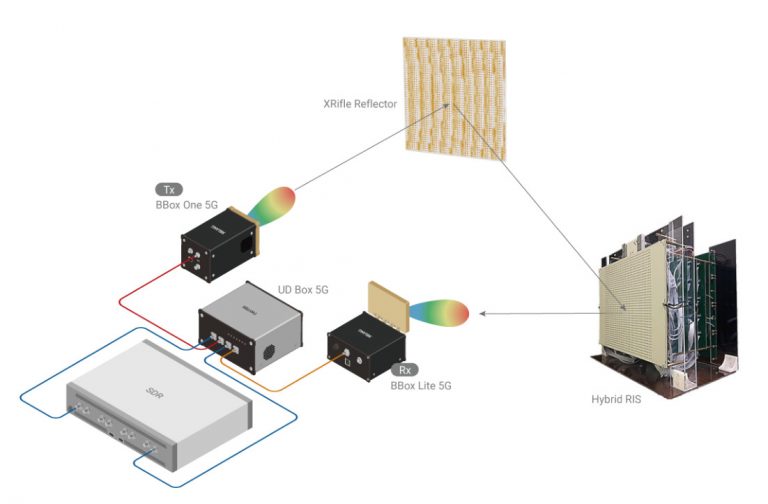 The signal is then reflected at 10-degrees towards the hybrid RIS, where it is received with a 0-degree incidence angle. Subsequently, it is further reflected at 50-degrees toward the BBox Lite receiving end. The signal is downconverted through the UD Box 5G and analyzed by the NI USRP to observe real-time EVM, spectrum, and constellation diagram changes.