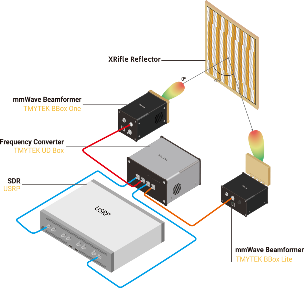 5G FR2 enables eMBB and URLLC with low latency and excellent reliability. However, mmWave faces significant propagation losses and can be blocked by obstacles, making it challenging to achieve optimal signal coverage at efficient costs. TMYTEK’s XRifle Reflector enables users to customize EM signal distributions, cover dead zones, and create cold zones.